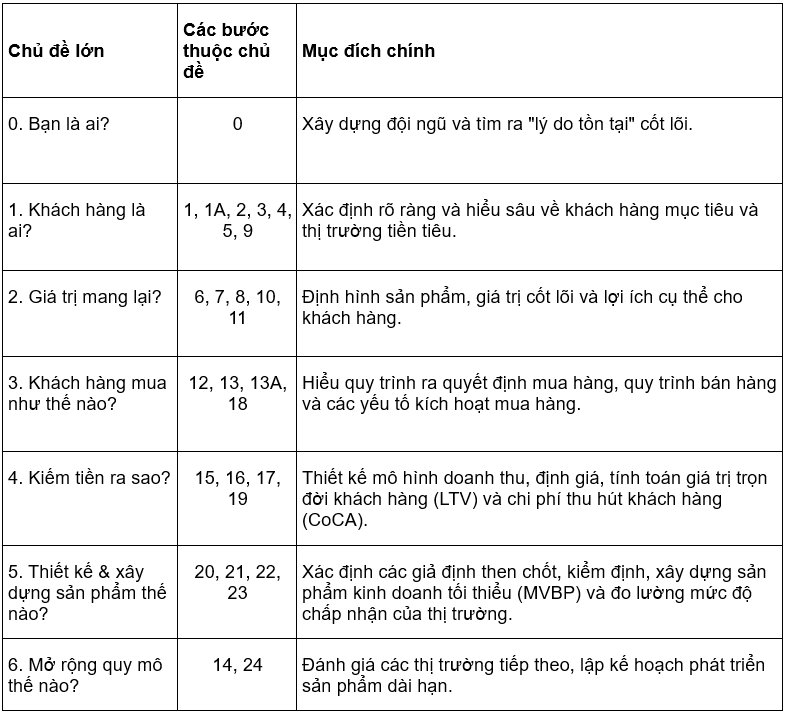 Trước khi đi sâu vào từng bước hành động, chúng ta hãy cùng nhìn qua 6 câu hỏi lớn (và 1 bước đệm) định hình toàn bộ vòng đời của một startup.